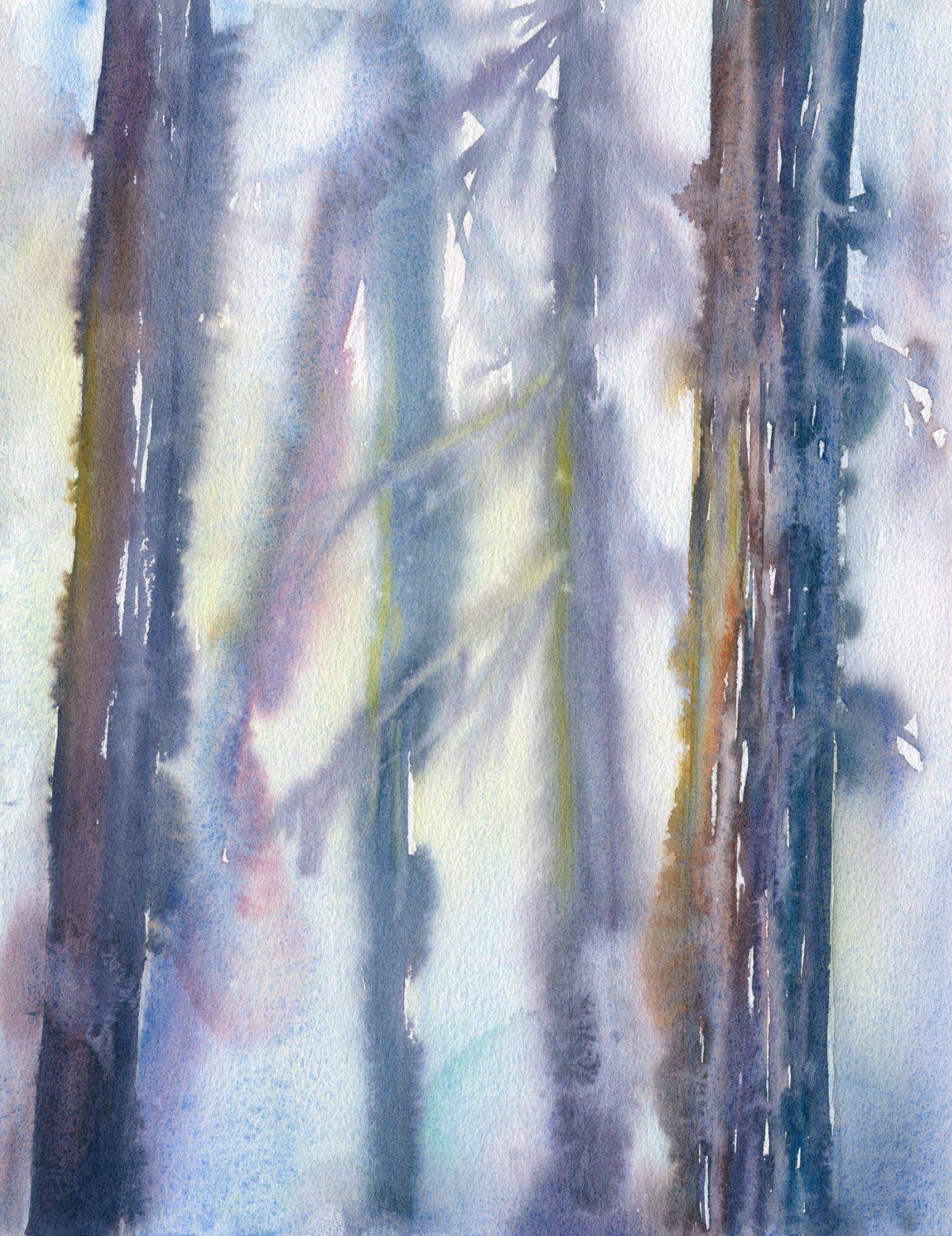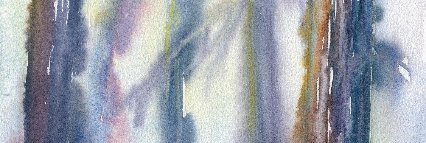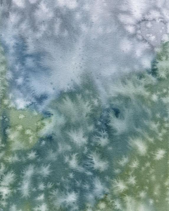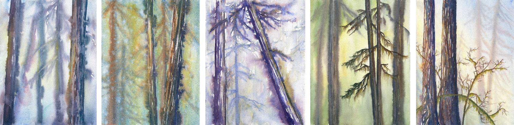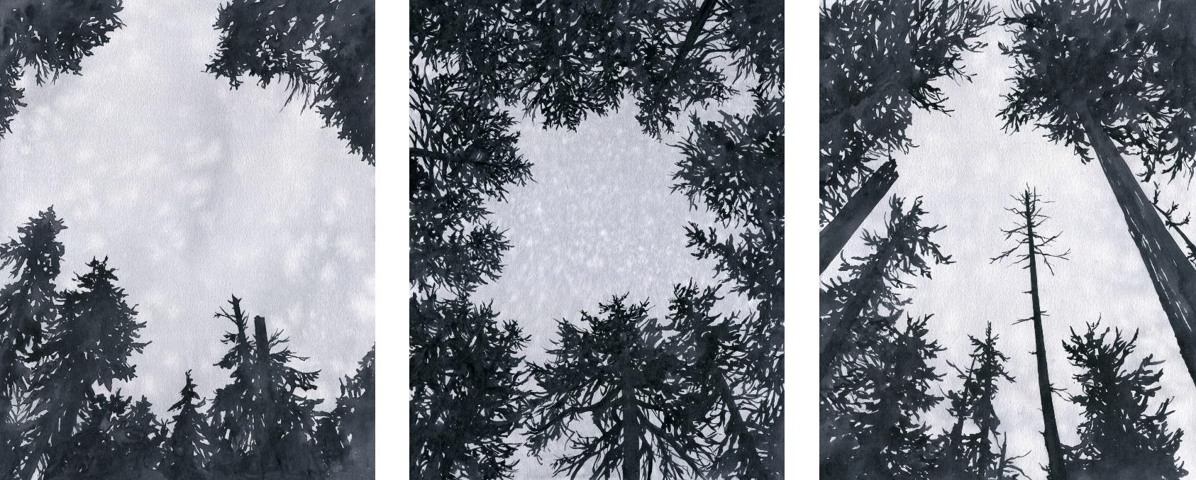 watercolor painting in purples and blues of dark fir trees in the foreground and, lighter, ridgelines behind them and above, a clouded grayblue sky. white spots on the image that blot out the color are where raindrops fell during the painting process.