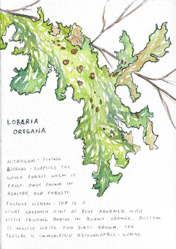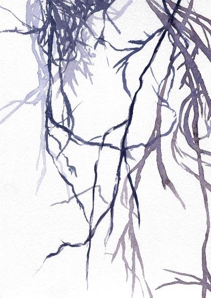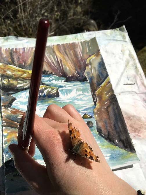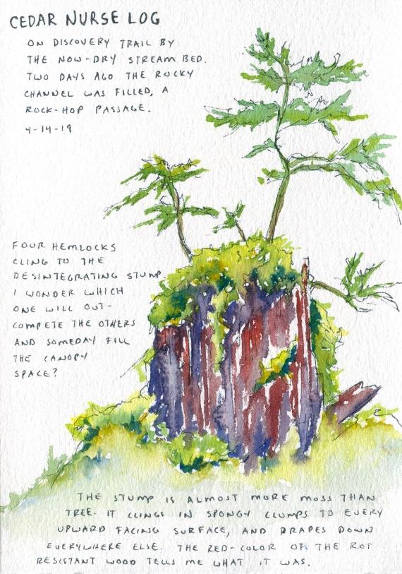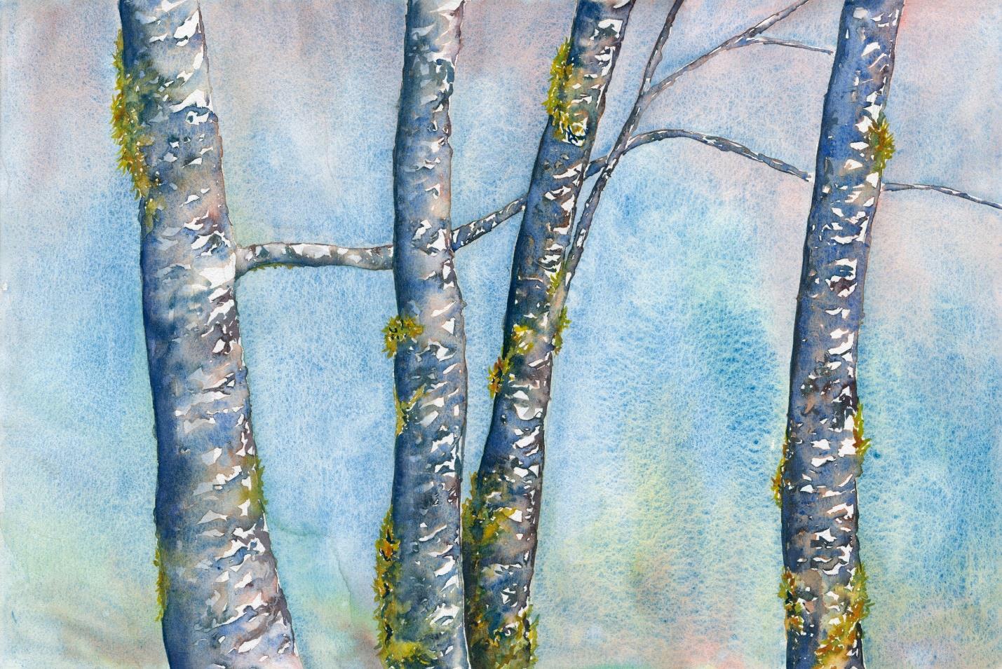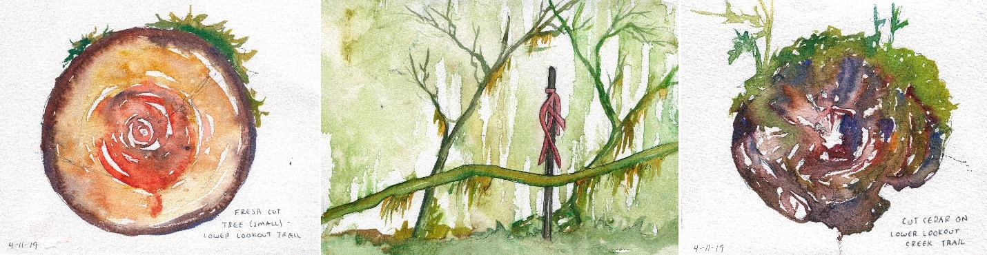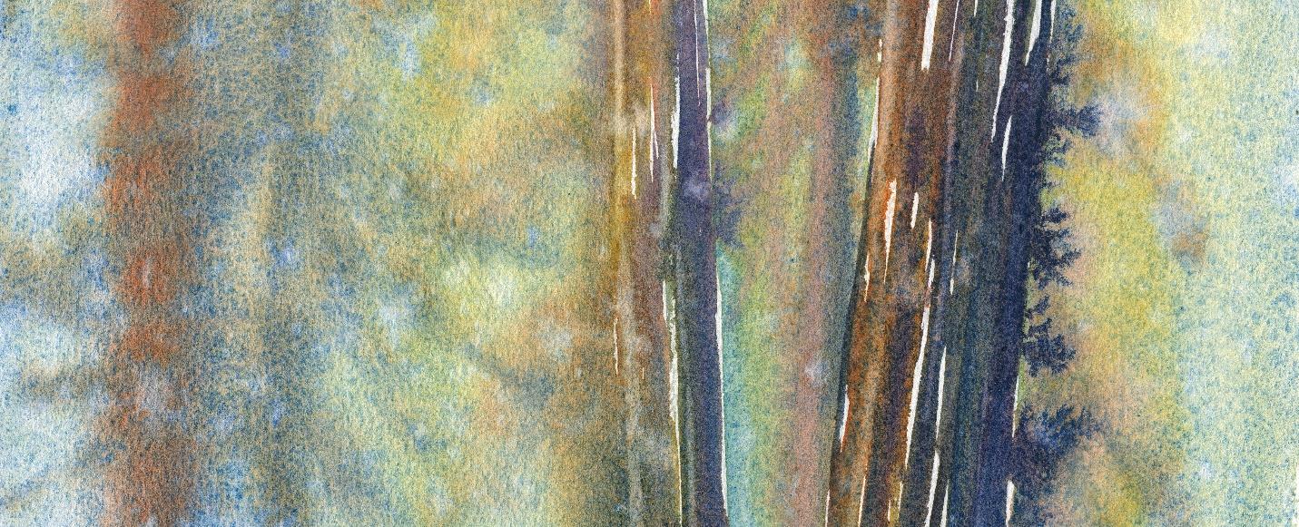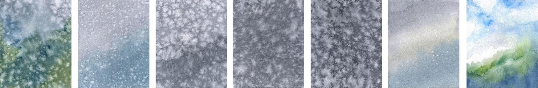 watercolor painting in purples and blues of dark fir trees in the foreground and, lighter, ridgelines behind them and above, a clouded grayblue sky. white spots on the image that blot out the color are where raindrops fell during the painting process.