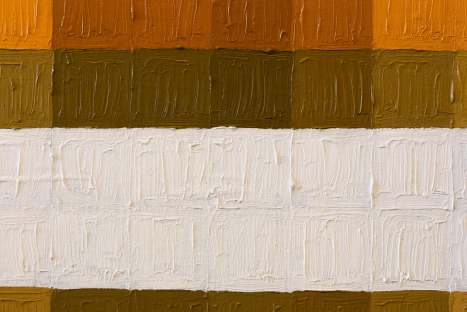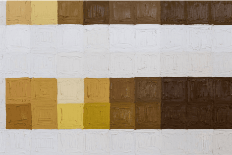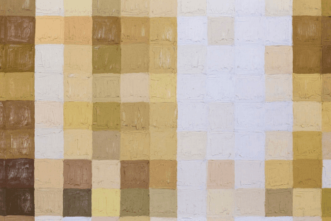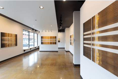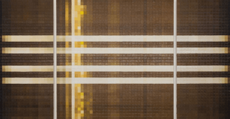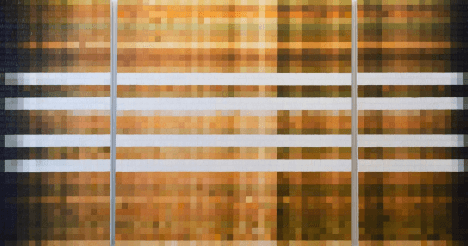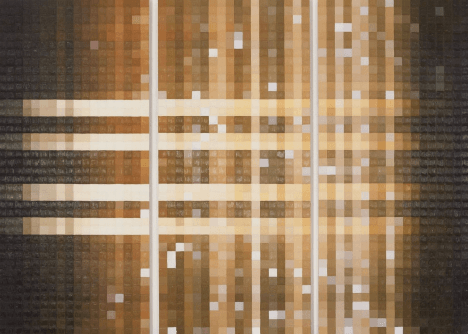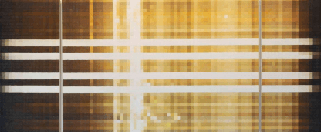 Forty colors were sampled from the same locations on each of the photographs. Those colors create the rhythm of color and light changes experienced throughout the day, and they also create the composition of the painting. The resulting patterns show something of an “absolute value” of light and color change during the day, rather than what we would experience in person as our eyes and brains constantly adjust our sensory perception. Each season’s paintings consists of three panels. The first and third panels show the colors samples for the first and last three hours of the day, respectively. The middle panel changes in width to accommodate the remaining time in the middle of the day.